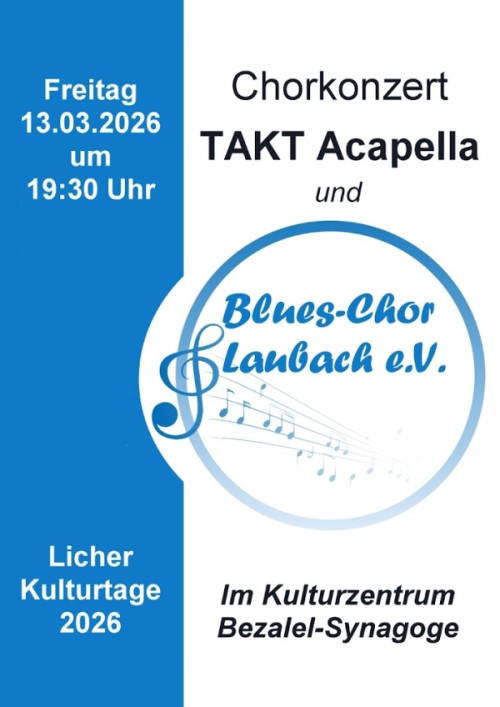 Unser erstes großes Highlight steht kurz bevor: Am 13. März gastieren wir bei den Licher Kulturtagen. Das Besondere an diesem Abend? Gemeinsam mit dem fantastischen Chor TAKT Acapella gestalten wir ein Konzert in der stimmungsvollen Atmosphäre der Bezalel-Synagoge in Lich.
