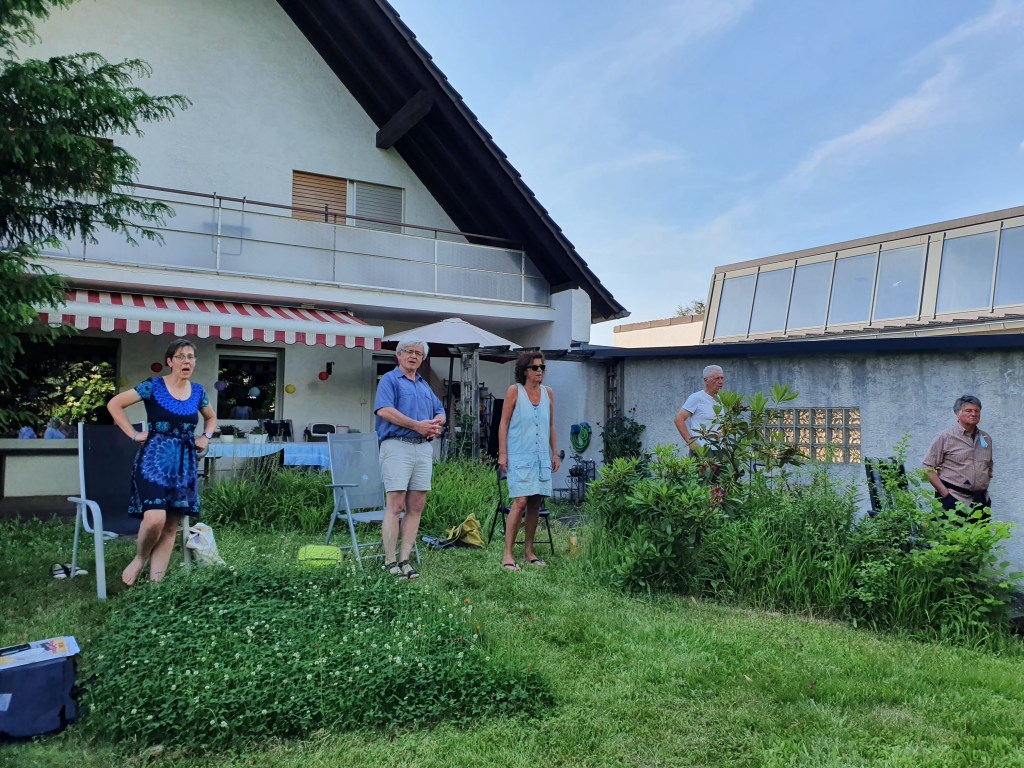 Endlich ist es wieder soweit: Der Blues-Chor Laubach probt bei trockenem Wetter wieder im Garten. Nach der langen Pause tut es gut, wieder miteinander singen zu können. „Dass die Chormitglieder auch in schwerer Zeit dabei geblieben sind, freut mich außerordentlich“ betonte Michael Schmidt (1. Vorsitzender) zur Begrüßung. Das Fehlen des verstorbenen Chorleiters Roland Becker war für alle schmerzlich bewusst.
