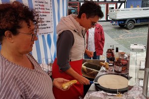 Unser Stand war durchweg gut besucht, die Tische voll besetzt. Sogar der Chorgründer, Herr Wolfgang Vater, hat unseren Stand besucht. Auch unser Chorleiter Hermann Wilhelmi war vor Ort und freute sich über das rege Treiben. Ein großes Lob geht an unsere 2. Vorsitzende, Gigi Vahldieck, die sich blitzschnell ins Crêpe backen eingearbeitet und zusammen mit Gisela Hörle bis zum Schluss unermüdlich für Nachschub gesorgt hat!
