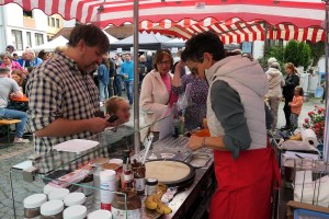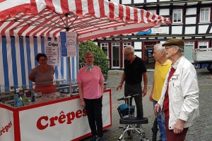 Unser Stand war durchweg gut besucht, die Tische voll besetzt. Sogar der Chorgründer, Herr Wolfgang Vater, hat unseren Stand besucht. Auch unser Chorleiter Hermann Wilhelmi war vor Ort und freute sich über das rege Treiben. Ein großes Lob geht an unsere 2. Vorsitzende, Gigi Vahldieck, die sich blitzschnell ins Crêpe backen eingearbeitet und zusammen mit Gisela Hörle bis zum Schluss unermüdlich für Nachschub gesorgt hat!